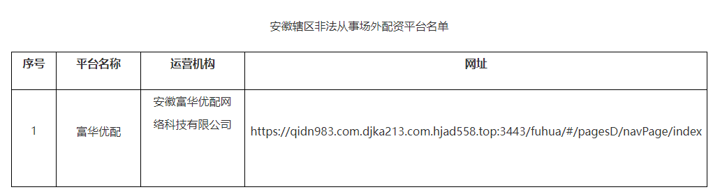 根据开源证券股份有限公司发布的非法仿冒证券公司、证券投资咨询公司等机构黑名单,富华优配位列其中。此外,安徽辖区非法从事场外配资平台名单也显示富华优配属于非法场外配资平台。